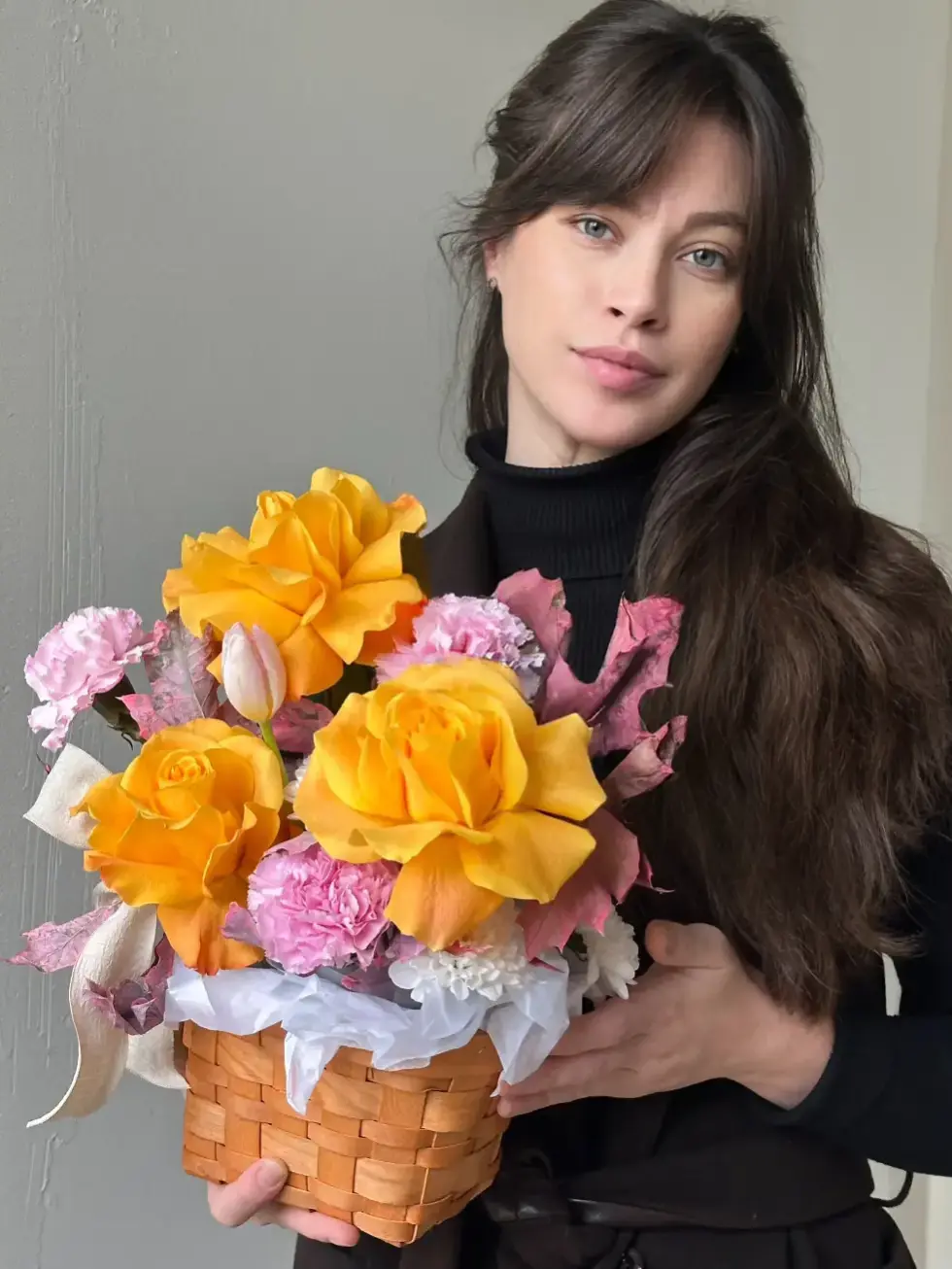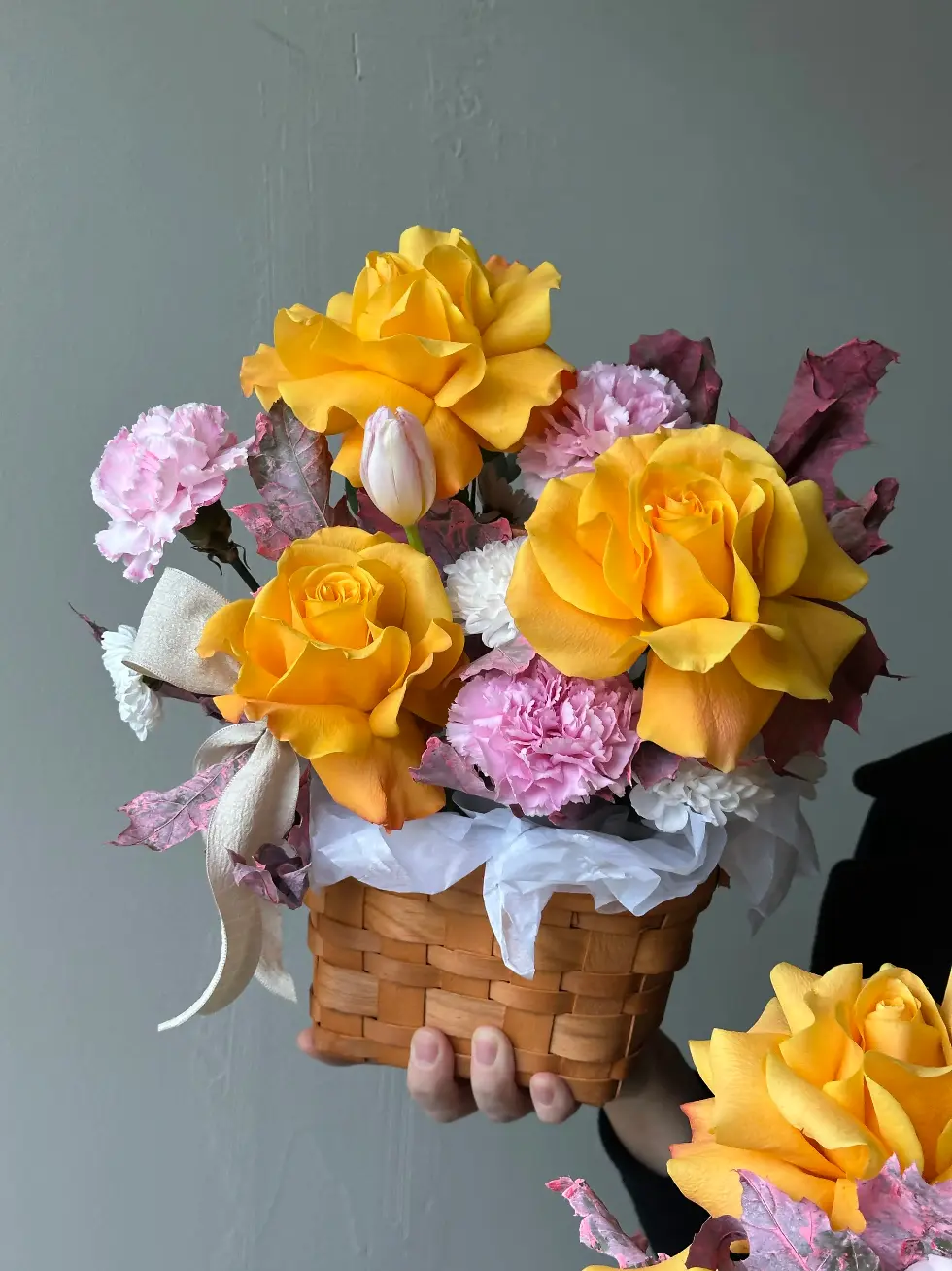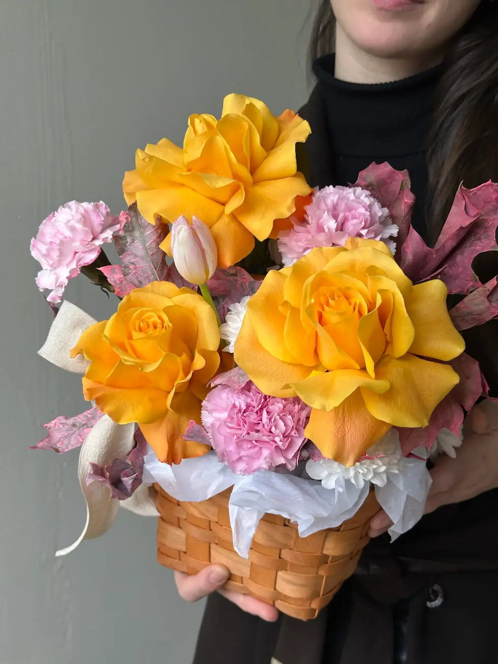 В состав букета могут входить сезонные цветы - пионы, тюльпаны, ранункулюсы, анемоны, гладиолусы, подсолнухи и так далее. Пожалуйста, уточняйте наличие сезонных позиций у менеджеров.