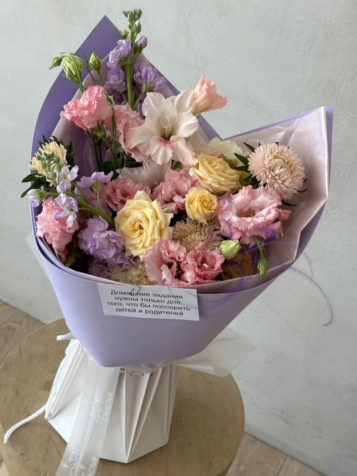 В состав букета могут входить сезонные цветы - пионы, тюльпаны, ранункулюсы, анемоны, гладиолусы, подсолнухи и так далее. Пожалуйста, уточняйте наличие сезонных позиций у менеджеров.